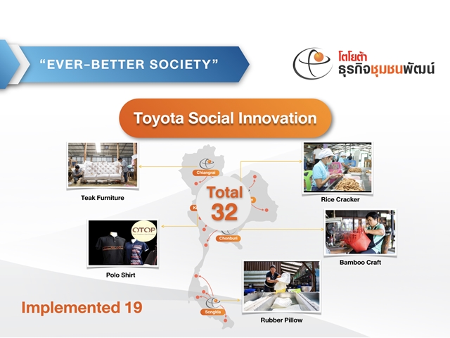และอีกหนึ่งความมุ่งมั่นในการส่งเสริมเศรษฐกิจที่ยั่งยืน โดยเรามีโครงการ "โตโยต้าธุรกิจชุมชนพัฒน์" (Toyota Social Innovation) เพื่อถ่ายทอดองค์ความรู้ด้านการบริหารธุรกิจและหลักปฏิบัติของโตโยต้าให้ผู้ประกอบการธุรกิจขนาดกลางและขนาดย่อมสามารถนำไปประยุกต์ใช้เพื่อเพิ่มผลกำไรและพัฒนาเศรษฐกิจในชุมชนได้อย่างมีประสิทธิภาพ ที่ผ่านมาเราได้ถ่ายทอดองค์ความรู้แก่ธุรกิจชุมชน 19 แห่งทั่วประเทศ และในปีนี้เราวางแผนที่จะขยายการดำเนินการเพิ่มเติมอีก 13 แห่ง ผมเชื่อมั่นเป็นอย่างยิ่งว่าโครงการนี้ จะเป็นตัวขับเคลื่อนสำคัญที่จะช่วยผลักดันให้เศรษฐกิจไทยเติบโตอย่างยั่งยืนได้ในท้ายที่สุด"