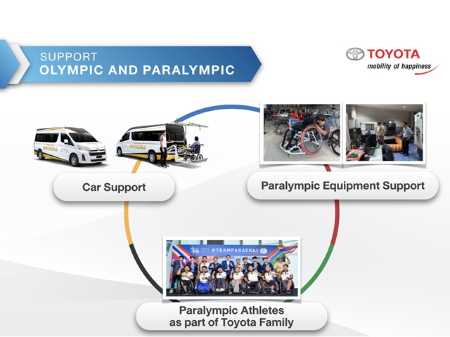 นอกจากนี้ โตโยต้า มอเตอร์ ประเทศไทย ยังได้ให้การสนับสนุนรถโตโยต้า คอมมิวเตอร์ รุ่นใหม่ล่าสุดสำหรับนักกีฬาโอลิมปิก และรถโตโยต้า คอมมิวเตอร์ เวลแค็บ ที่มีการปรับแต่งพิเศษสำหรับนักกีฬาพาราลิมปิก ยิ่งไปกว่านั้น จากการที่โตโยต้ามีความเชี่ยวชาญด้านการพัฒนาเทคโนโลยีการขับเคลื่อน เราจึงตั้งใจที่จะถ่ายทอดความรู้ความสามารถที่มีในการช่วยพัฒนาอุปกรณ์ในการฝึกซ้อมของนักกีฬาพาราลิมปิก ที่สำคัญเรามีความยินดีที่จะมอบโอกาสให้นักกีฬาพาราลิมปิกเข้ามาเป็นส่วนหนึ่งของครอบครัวโตโยต้า เริ่มต้นด้วยการรับนักกีฬาพาราลิมปิก 4 คนเข้ามาเป็นพนักงานของบริษัทฯ