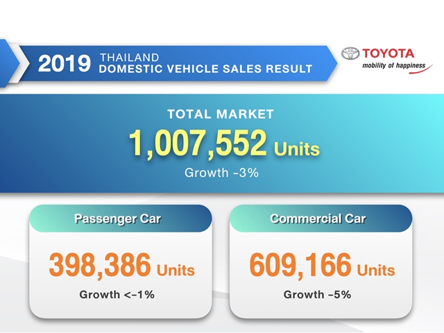 โตโยต้า มอเตอร์ ประเทศไทย แถลงสถิติการจำหน่ายรถยนต์ปี 2562 พร้อมคาดการณ์ตลาดรถยนต์ไทยปี 2563 โดย มร.มิจิโนบุ ซึงาตะ กรรมการผู้จัดการใหญ่ บริษัท โตโยต้า มอเตอร์ ประเทศไทย จำกัด เผยว่ายอดขายรถยนต์รวมในประเทศไทยปี 2562 ลดลง 3% โดยมียอดขายอยู่ที่ 1,007,552 คัน แต่อย่างไรก็ตามครั้งนี้ยังถือได้ว่าเป็นครั้งที่สี่ในประวัติศาสตร์ของตลาดรถยนต์ไทยที่มียอดขายถึงระดับหนึ่งล้านคัน ถึงแม้ว่าตลาดรถยนต์มีการหดตัวอย่างเห็นได้ชัดในช่วงครึ่งปีหลัง โดยเฉพาะอย่างยิ่งนับตั้งแต่เดือนกันยายนผ่านมา