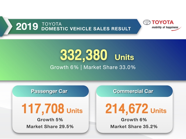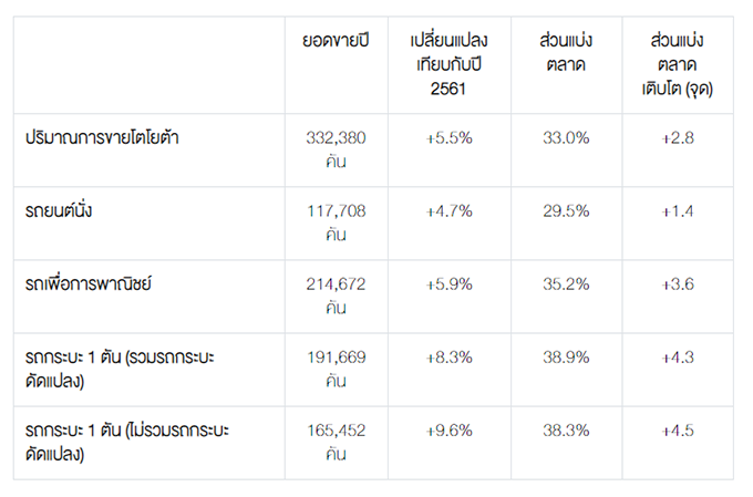 สำหรับยอดขายโตโยต้าในปี 2562 สามารถสร้างยอดขายเพิ่มขึ้นสวนทางกับสถานการณ์ตลาดที่หดตัวลง โดยโตโยต้ามียอดขายอยู่ที่ 332,380 คัน เพิ่มขึ้นประมาณ 6% ครองส่วนแบ่งการตลาด 33.0% เพิ่มขึ้นจากปีที่แล้ว 2.8 จุด โดยปัจจัยหลักมาจากการตอบรับที่ดีของลูกค้าและจากการเปิดตัวรถยนต์รุ่นใหม่และรุ่นปรับปรุงใหม่ของรถยนต์นั่งอย่าง