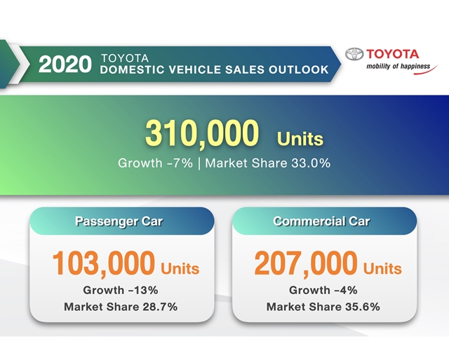 ส่วนเป้าหมายของโตโยต้าในปี 2563 โตโยต้ามีเป้าหมายการขายที่ 310,000 คัน ด้วยส่วนแบ่งการตลาดที่ 33.0% ลดลงประมาณ 7% เมื่อเทียบกับปีที่ผ่านมา และเพื่อบรรลุเป้าหมายนี้เราจะเสริมสร้างความแข็งแกร่งด้วยการเพิ่มความหลากหลายของผลิตภัณฑ์ เพื่อตอบสนองความต้องการของลูกค้าให้ดียิ่งขึ้น พร้อมยกระดับประสบการณ์การเป็นเจ้าของรถยนต์โตโยต้าด้วยการดูแลเอาใจใส่ลูกค้านับตั้งแต่วันแรกที่ซื้อรถยนต์ ตลอดจนวันสุดท้ายของการใช้งาน