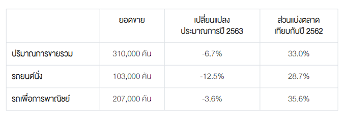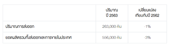 สำหรับแนวโน้มตลาดรถยนต์ของปี 2563 นั้นนับเป็นปีที่ท้าทายอีกปีหนึ่งสำหรับตลาดรถยนต์ไทย เนื่องจากตลาดรถยนต์ยังคงเผชิญกับหลายปัจจัย จากความเชื่อมั่นของผู้บริโภคต่อภาวะเศรษฐกิจโลกที่ไม่แน่นอนและมาตรการควบคุมสินเชื่อรถยนต์ที่มีความเข้มงวดมากขึ้น ดังนั้นเราจึงคาดการณ์ว่าตลาดรถยนต์รวมในประเทศจะอยู่ที่ 940,000 คัน ลดลงประมาณ 7% เมื่อเทียบกับปีที่ผ่านมา