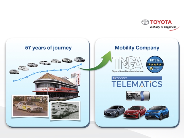 ปัจจุบันอุตสาหกรรมยานยนต์ได้ก้าวเข้าสู่ยุคแห่งการปฏิรูปในรอบศตวรรษ โดยโตโยต้ามุ่งมั่นที่จะเปลี่ยนแปลงองค์กรจากเดิมที่เป็นบริษัทผู้ผลิตรถยนต์ สู่การเป็น "องค์กรแห่งการขับเคลื่อน" (Mobility Company) ซึ่งหมายความว่าเราจะมุ่งเดินหน้าพัฒนาการบริการต่างๆ ที่เกี่ยวข้องกับการขับเคลื่อนอย่างต่อเนื่องเพื่อตอบสนองความต้องการของผู้คนในสังคมได้อย่างมีประสิทธิภาพ