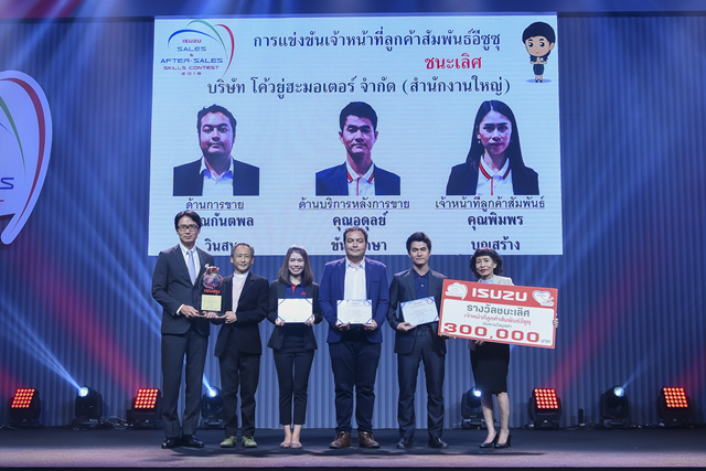 รางวัลชนะเลิศ เจ้าหน้าที่ลูกค้าสัมพันธ์อีซูซุ ได้แก่ คุณกันตพล วินสน (ด้านการขาย). คุณอดุลย์ ขันธรักษา (ด้านบริการหลังการขาย) และ คุณพิมพร บุญสร้าง (เจ้าหน้าที่ลูกค้าสัมพันธ์) จากบริษัท โค้วยู่ฮะมอเตอร์ จํากัด (สำนักงานใหญ่) รับเงินรางวัล 300,000 บาท พร้อมโล่เกียรติยศ และประกาศนียบัตร