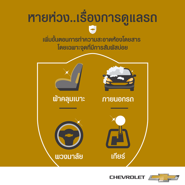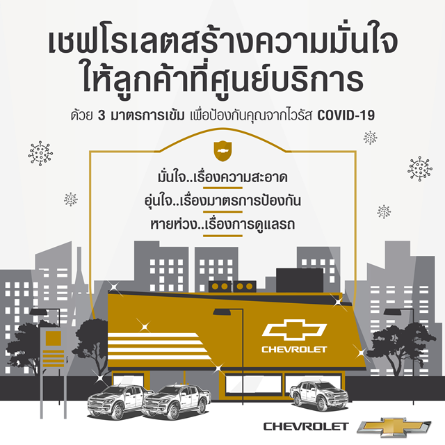 เชฟโรเลต ประเทศไทย ยังได้เน้นย้ำมาตรการด้านความสะอาดและสุขอนามัยอย่างเข้มข้น และได้มอบแนวทางปฏิบัติให้กับตัวแทนจำหน่ายและศูนย์บริการของเชฟโรเลตทั่วประเทศ เพื่อให้ลูกค้าของเชฟโรเลตได้รับความปลอดภัยอย่างสูงสุดเมื่อเข้ารับบริการ