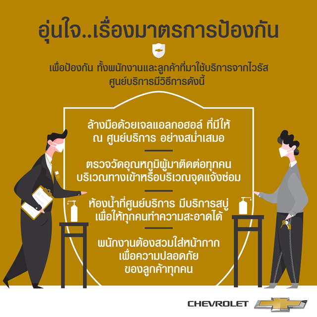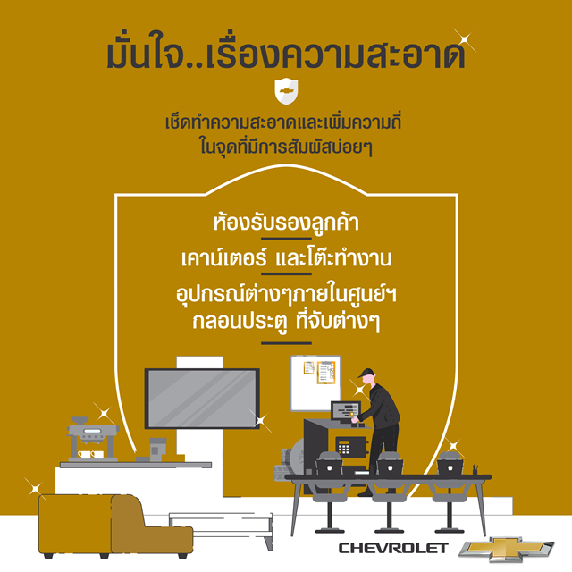 เพื่อให้ลูกค้าทุกท่านที่เข้ารับการบริการจากเชฟโรเลตมั่นใจในความปลอดภัยในช่วงแพร่ระบาดของโรคโควิด-19 เชฟโรเลต ประเทศไทย ได้มอบแนวทางปฏิบัติด้านความสะอาดและสุขอนามัยในศูนย์บริการและตัวแทนจำหน่ายเชฟโรเลตทั่วประเทศ ดังนี้: