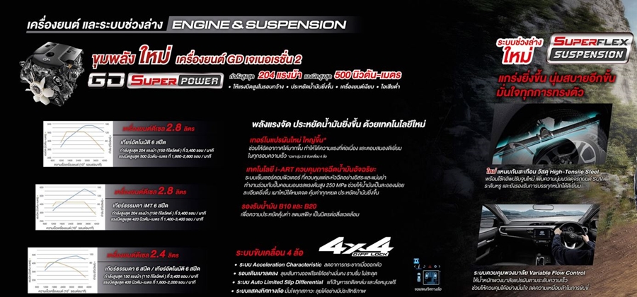 นอกจากนี้ในด้านสมรรถนะการขับขี่ได้ปรับปรุงขุมพลังใหม่ เครื่องยนต์ GD เจเนเรชั่นที่ 2 GD Super Power ให้กำลังสูงสุดถึง 204 แรงม้า และแรงบิดสูงสุด 500 นิวตันเมตร พร้อมทั้งยังมีการพัฒนาประสิทธิภาพการขับขี่ระบบขับเคลื่อน 4 ล้อ (4WD) ที่ทำงานร่วมกับช่วงล่างใหม่ Super Flex Suspension ที่เกาะถนนและนุ่มนวลยิ่งขึ้น เพิ่มสมรรถนะการบุกตะลุย มอบประสบการณ์การขับขี่ ขึ้น-ลงเขาที่ง่ายดายกว่าเดิม รองรับน้ำมันดีเซล B10 และ B20
