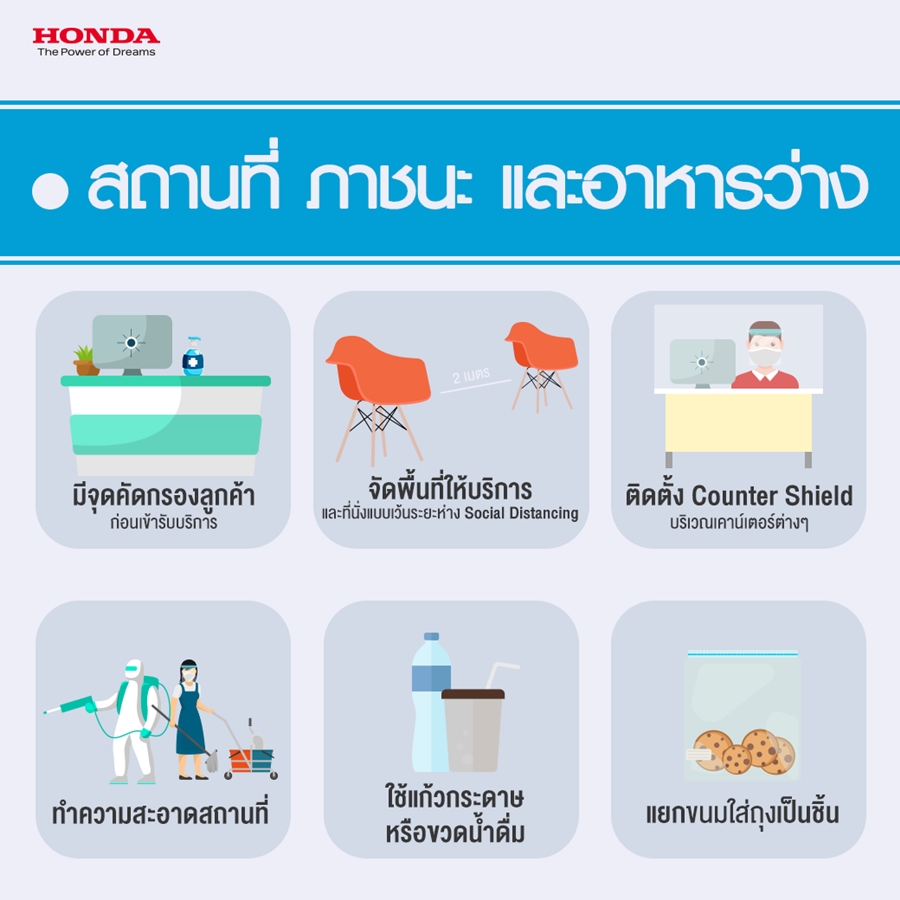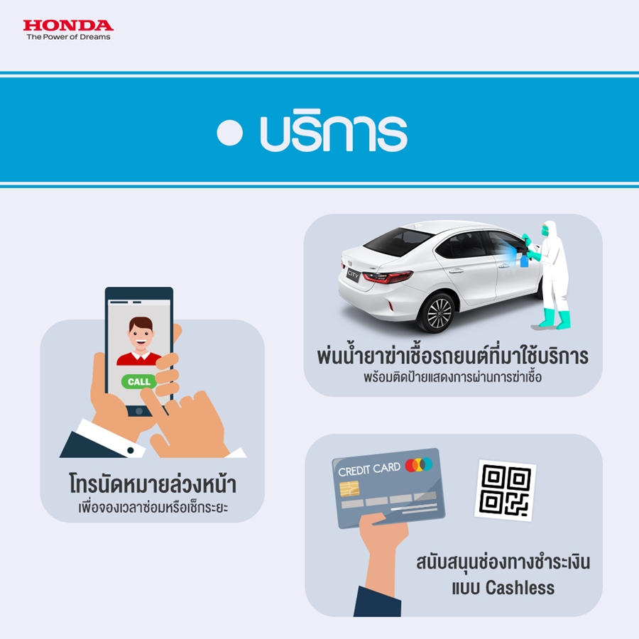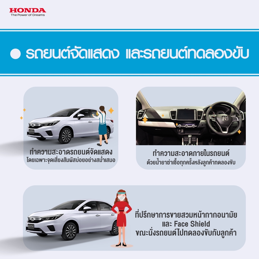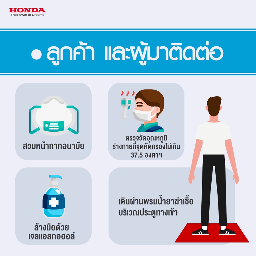 ที่โชว์รูมและศูนย์บริการฮอนด้า ได้กำหนดจุดคัดกรองเพื่อตรวจวัดอุณหภูมิร่างกายของลูกค้าและผู้มาติดต่อทุกท่านก่อนเข้าใช้บริการ พร้อมทั้งเตรียมพรมน้ำยาฆ่าเชื้อบริเวณทางเข้า และให้สวมหน้ากากอนามัยตลอดเวลา รวมถึงจัดเตรียมเจลแอลกอฮอล์ล้างมือบริการที่ทางเข้า-ออก และจุดต่าง ๆ และหากลูกค้าต้องการนำรถมาเข้ารับบริการ มีบริการแจ้งให้ลูกค้าโทรนัดหมายล่วงหน้าเพื่อจองเวลาในการเข้าซ่อมหรือเช็กระยะ (Booking Service) พร้อมติดตั้ง Counter Shield บริเวณเคาน์เตอร์ให้บริการ และจัดที่นั่งโดยเว้นระยะห่าง 1 - 2 เมตร