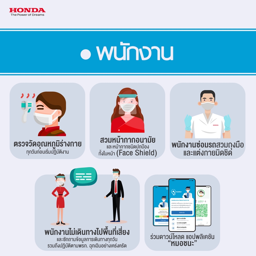 พนักงานต้องตรวจวัดอุณหภูมิร่างกายทุกวันก่อนเริ่มปฏิบัติงานและต้องสวมหน้ากากอนามัยตลอดเวลาที่ปฏิบัติงาน สำหรับพนักงานที่ใกล้ชิดลูกค้าเป็นพิเศษ เช่น ที่ปรึกษาทางการขาย ที่ปรึกษางานบริการ พนักงานต้อนรับ ต้องสวมใส่หน้ากากอนามัย ควบคู่ไปกับ Face Shield ตลอดระยะเวลาที่ให้บริการ ในส่วนของพนักงานส่วนงานซ่อมบำรุง ต้องสวมถุงมือทุกครั้งขณะปฏิบัติงานและเปลี่ยนทุกครั้งเมื่อเสร็จงานรวมทั้งต้องแต่งกายมิดชิดและรัดกุมเพื่อความปลอดภัย โดยพนักงานทุกคนต้องร่วมดาวน์โหลดแอปพลิเคชัน "หมอชนะ" ในการประเมินความเสี่ยงต่อการติดเชื้อของตนเอง