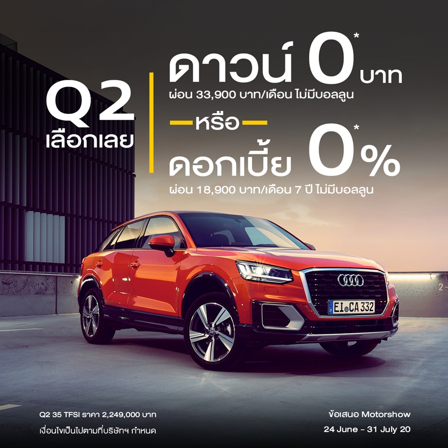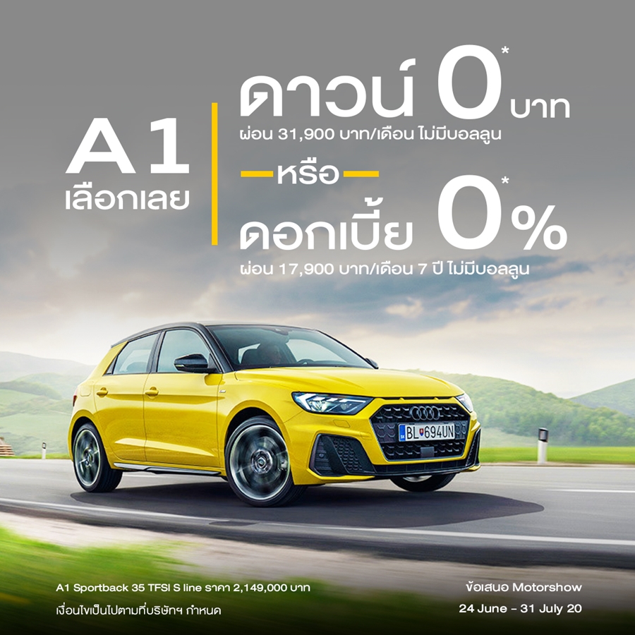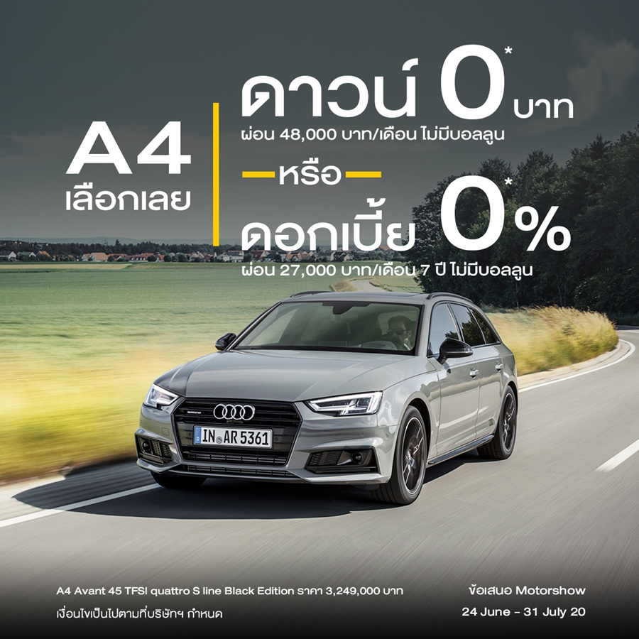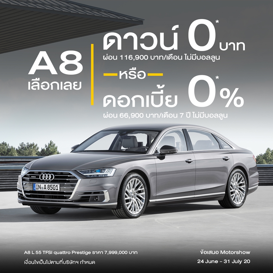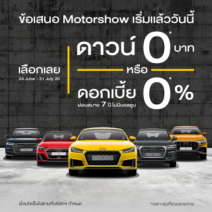 Audi จัดให้ ประกาศแคมเปญมอเตอร์โชว์ "ดาวน์ 0 บาทหรือจะเลือกผ่อนสบายๆ 0% นาน 7 ปี ไม่มีบอลลูน"