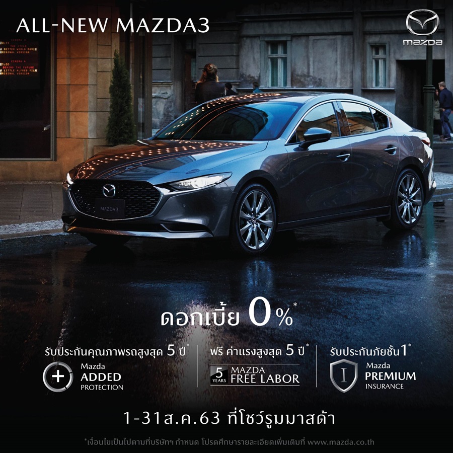 สำหรับ All-New Mazda3 มีให้เลือก 2 สไตล์ ทั้งแบบซีดาน 4 ประตู และฟาสท์แบค 5 ประตู ราคาจำหน่าย เริ่มต้น 969,000 บาท ดอกเบี้ย 0% ฟรีค่าแรงเช็คระยะ 5 ปี หรือ 100,000 กิโลเมตร* ขยายการรับประกันคุณภาพเป็น 5 ปี หรือ 150,000 กิโลเมตร** พร้อมฟรีประกันภัยชั้นหนึ่ง Mazda Premium Insurance
