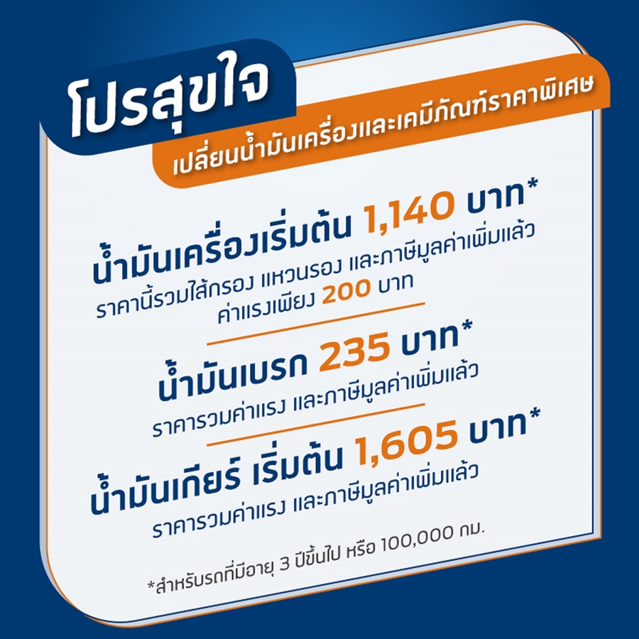- เปลี่ยนน้ำมันเครื่องพร้อมไส้กรอง แหวนรอง ค่าแรงเพียง 200 บาท ราคาพิเศษเริ่มต้นที่ 1,140 บาท สำหรับรถที่มีอายุ 3 ปีขึ้นไป หรือ 100,000 กม.