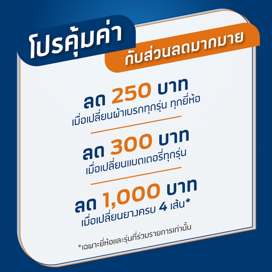 - รับส่วนลด 250 บาท เมื่อเปลี่ยนผ้าเบรครถทุกรุ่นทุกยี่ห้อ
