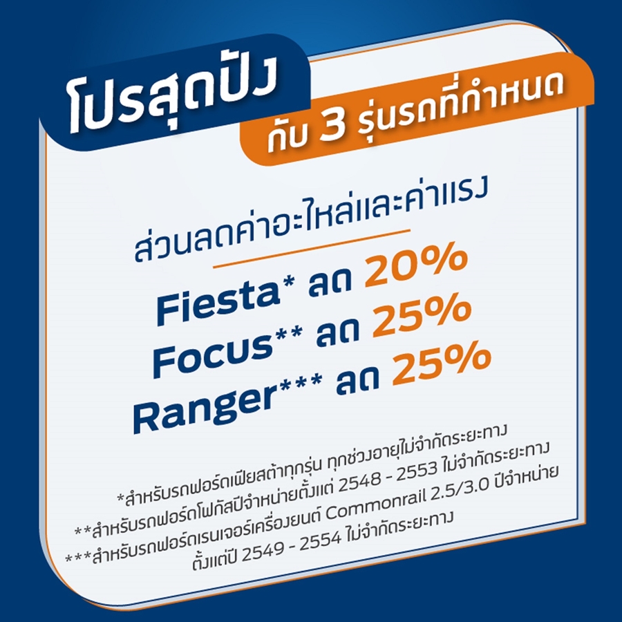 - ส่วนลดค่าอะไหล่และค่าแรง 25% สำหรับ ฟอร์ด โฟกัส ปีจำหน่ายตั้งแต่ปี 2548-2553 ไม่จำกัดระยะทาง