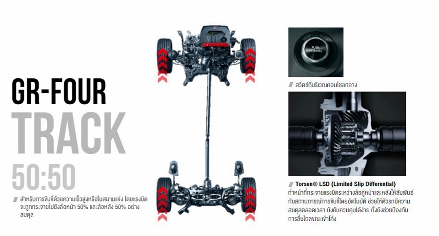 สามารถทำความเร็วได้สูงสุดถึง 230 กม./ชม.โดยพละกำลังทั้งหมดจากเครื่องยนต์จะถูกถ่ายทอดผ่านระบบขับเคลื่อน 4 ล้อ สไตล์สปอร์ตใหม่ล่าสุด ที่เรียกว่า "GR-FOUR" ผู้ขับขี่สามารถเลือกโหมดการทำงานให้เหมาะสมกับสภาพถนนและสไตล์การขับขี่ได้ถึง 3 รูปแบบ ที่แยกแรงบิดระหว่างล้อหน้าและล้อหลัง คือ Normal (60/40) Sport (30/70) และ Track (50/50) เพื่อช่วยให้การทรงตัวและยึดเกาะได้อย่างมั่นคงในทุกสภาพถนน แม้ขณะเข้าโค้งด้วยความเร็วสูง ให้สมรรถนะการขับขี่ที่ดีเยี่ยมด้วยเทคโนโลยีจากสนามแข่งสู่ท้องถนน