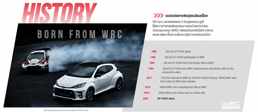 Toyota GR Yaris รถสปอร์ต Hot hatch สายพันธุ์แรง แชมป์แรลลี่โลก ได้ถูกพัฒนาจากประสบการณ์จากทีมรถแข่งมอเตอร์สปอร์ตระดับโลกของ โตโยต้า "Toyota Gazoo Racing" ในการใช้ความเชี่ยวชาญและประสบการณ์การออกแบบรถยนต์จากสนามแข่ง WRC - World Rally Championship สู่การสร้างรถยนต์รุ่นใหม่ที่ให้สมรรถนะการตอบสนองเช่นเดียวกับรถยนต์ระดับแข่งขัน