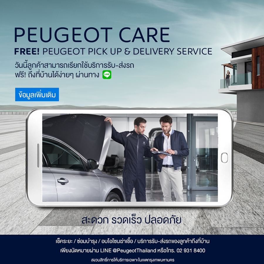 เปอโยต์ นำเสนอโปรแกรมหลังการขายที่มีความหลากหลาย เพื่อสร้างความพึงพอใจสูงสุด ให้กับลูกค้าในประเทศไทย ภายใต้คอนเซปต์ PEUGEOT CARE ซึ่ง เปอโยต์ นับเป็นแบรนด์รถยนต์รายแรกในประเทศไทย ที่นำเสนอบริการผ่านแอพพลิเคชัน LINE อาทิ บริการรับรถลูกค้าจากที่บ้านหรือออฟฟิศ เพื่อไปเข้าศูนย์บริการ และนำกลับมาส่ง, การนำรถยนต์ไปให้ทดลองขับถึงที่บ้าน และการจองรถยนต์ใหม่ รวมถึงรถผู้บริหาร สภาพดี ไมล์น้อย