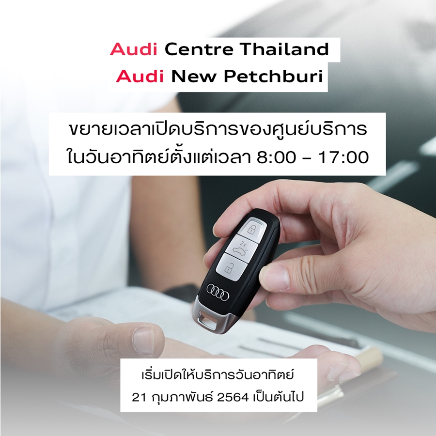 ในส่วนของวันให้บริการจะมีการขยายเพิ่มการบริการในวันอาทิตย์ (ยกเว้นวันหยุดนักขัตฤกษ์) พร้อมขยายเวลาเปิดบริการของศูนย์บริการในวันอาทิตย์ตั้งแต่เวลา 8:00 - 17:00 โดยจะเริ่มเปิดให้บริการวันอาทิตย์ที่ 21 กุมภาพันธ์ 2564 ที่ Audi Centre Thailand สาขาเลียบด่วนเอกมัยรามอินทรา และ Audi สาขาถนนเพชรบุรีตัดใหม่ เพื่ออำนวยความสะดวกและตอบโจทย์ไลฟ์สไตล์ของลูกค้า และเพื่อความรวดเร็วในการบริการ อันเป็นปัจจัยสำคัญที่สร้างความพึงพอใจให้ลูกค้า