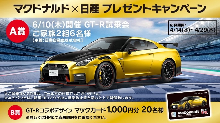 นิสสัน GT-R เวอร์ชัน แม็คโดนัลด์ จะไม่มีการผลิตเพื่อขายแต่อย่างใด คันนี้สร้างขึ้นมาก็เพื่อใว้ให้ผู้โชคดีร่วมกิจกรรมกับ แม็คโดนัลด์ ญี่ปุ่น โดยผู้เข้าร่วมจะได้โอกาสขับทดสอบ GT-R เวอร์ชัน แม็คโดนัลด์ ในสนามปรูฟวิ่งกราวด์ โดยมีเจ้าหน้าที่นิสสันร่วมด้วยเพื่อมอบประสบการณ์สุดท้าทายในครั้งนี้ อย่างไรก็ตามจะมีผู้โชคดีเพียง 2 ครอบครัว และขับได้มากสุด 3 ท่านเท่านั้น แต่ก็มีรางวัลปลอบใจให้กับอีก 20 คน ที่พลาดรางวัลใหญ่ ไม่ได้ขับ แต่ได้กิฟท์การ์ดกับภาพถ่ายกับรถ