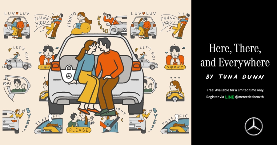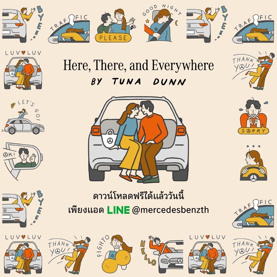 เมอร์เซเดส-เบนซ์ ส่งสติกเกอร์ไลน์ชุดพิเศษในชื่อ Here, There and Everywhere โดยเลือก Tuna Dunn หรือ ตุล-ตุลยา ตุลย์วัฒนจิต ศิลปินและ illustrator เจ้าของลายเส้นที่มีความโดดเด่นในเรื่องของการบอกเล่าเรื่องราวที่ดูเรียบง่ายแต่โดนใจมาเป็นผู้ออกแบบ โดยเมอร์เซเดส-เบนซ์ ประเทศไทยพร้อมให้ทุกคนที่ add friend กับเมอร์เซเดส-เบนซ์ ที่ Mercedes-Benz TH แล้วลงทะเบียนกับเราผ่านทางแอพพลิเคชัน Line สามารถดาวน์โหลดไปใช้ได้ทันที โดยสติกเกอร์ไลน์ชุดนี้ นำเสนอออกมาในคอนเซ็ปต์ของการบอกเล่าเรื่องราวผ่านความสัมพันธ์ของชายหนุ่มและหญิงสาวที่สื่อสารกันด้วยคำพูดที่ทุกคนสามารถใช้ได้ในชีวิตประจำวัน โดยใช้ลายเส้นที่เรียบง่าย ให้ทุกคนได้สนุกกับสีสันใหม่จากเมอร์เซเดส-เบนซ์พร้อมนำไปใช้พูดคุยกับเพื่อน ๆ และคนใกล้ชิดได้อย่างเต็มที่