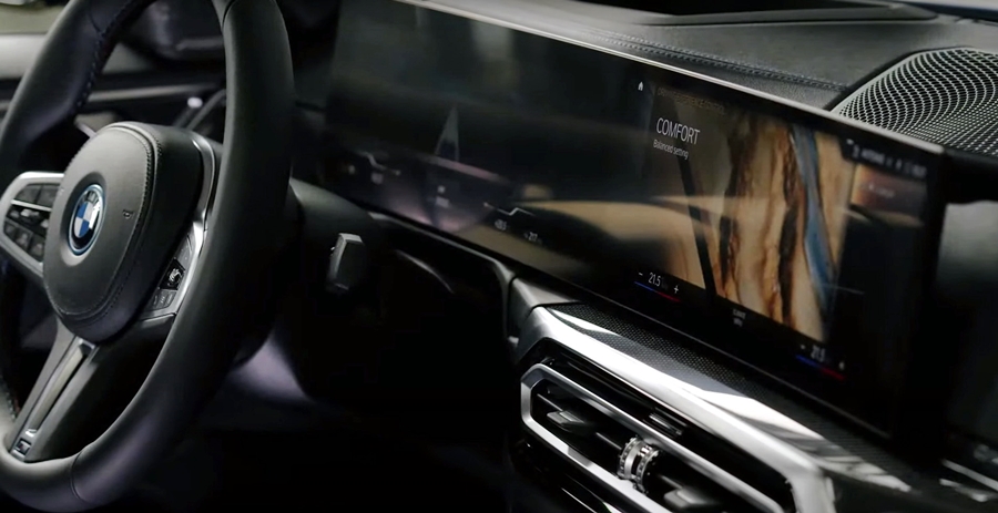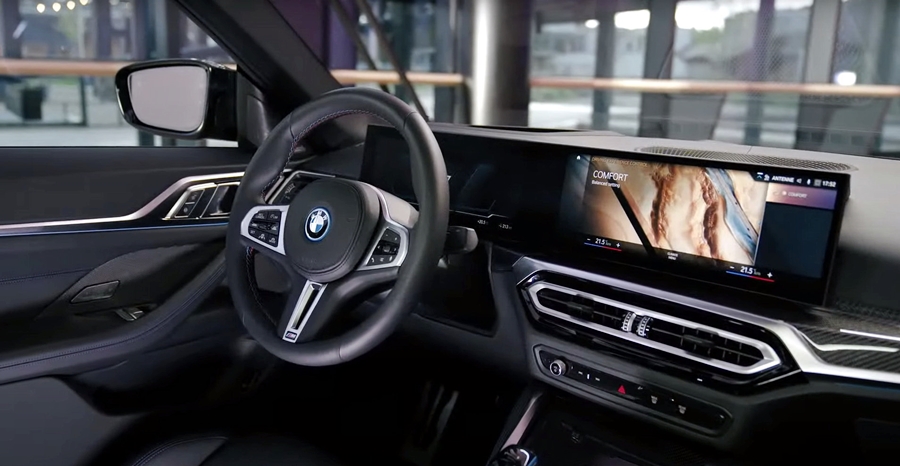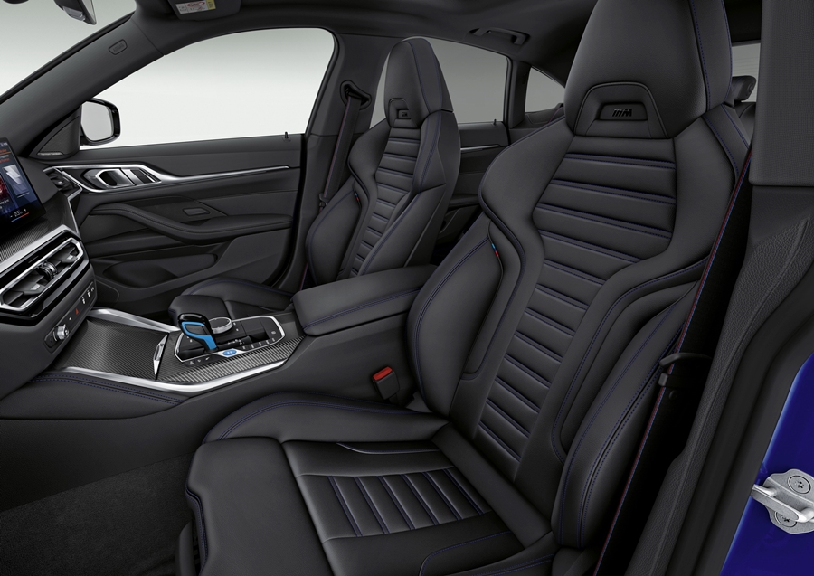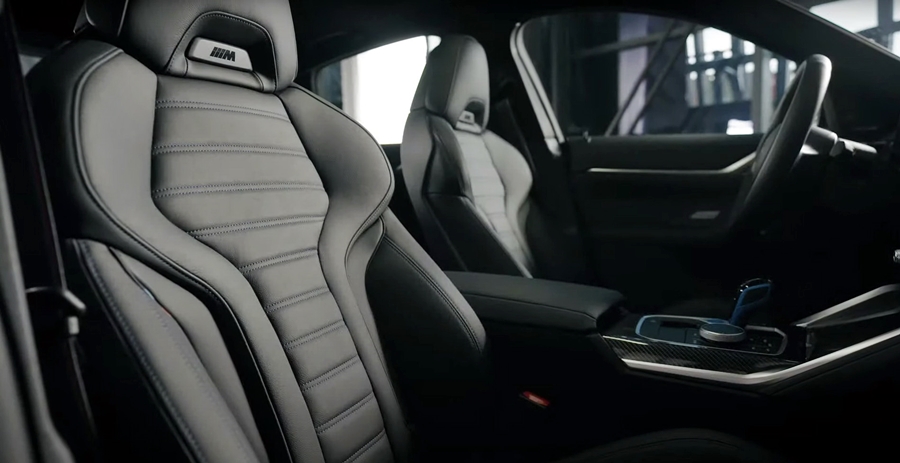 มาดูภายในรถมีหน้าจอโค้งมหึมาแบบเดียวกับใน iX ยังมีปุ่มโหมดการขับขี่อยู่ใกล้คันเกียร์ เบาะบักเก็ตซีตคู่หน้าถูกยืมมาจาก M3 และ M4 แต่ใช้โทนสีอ่อนกว่า