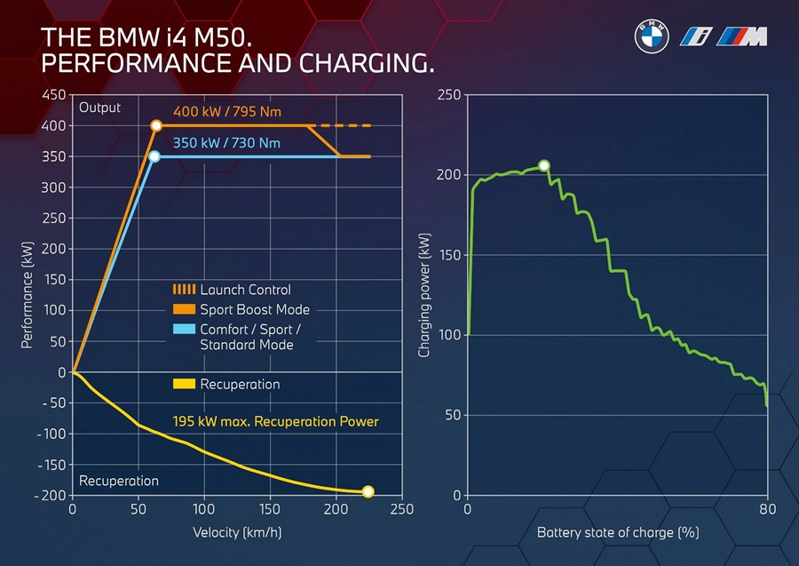 BMW i4 M50 มาพร้อมแบตเตอรี่ที่สามารถพารถสปอร์ตคันนี้วิ่งได้ไกลถึง 395 กม. ต่อการชาร์จเต็ม 1 ครั้ง ซึ่งใช้เวลา 7.6 ชั่วโมงด้วยเครื่องชาร์จขนาด 11kw นอกจากนี้ยังมีระบบชาร์จเร็วด้วยกำลังไฟฟ้า 200kW จาก 10% - 80% ในเวลาเพียง 31 นาที