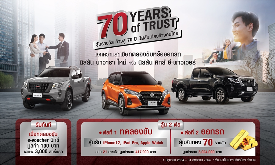 "ฉลองก้าวสู่ปีที่ 70 เคียงข้างคนไทย" นิสสัน มอบแคมเปญขอบคุณลูกค้าเมื่อทดลองขับ หรือออกรถ พร้อมลุ้นรับรางวัลพิเศษ