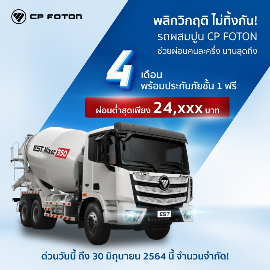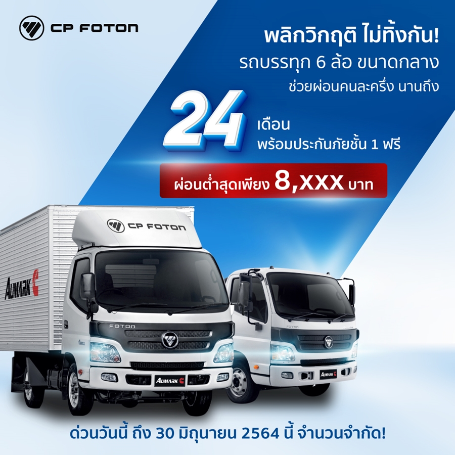 FOTON รถเพื่อการพาณิชย์ โดยบริษัท ซีพี โฟตอน เซลส์ จำกัด ปล่อยแคมเปญ "พลิกวิกฤต ไม่ทิ้งกัน! ช่วยผ่อนคนละครึ่ง นานสูงสุด 24 เดือน พร้อมประกันภัยชั้น 1 ฟรี" สำหรับรถบรรทุก และรถบัส ซีพี โฟตอน ตั้งแต่วันนี้ถึง 30 มิถุนายน 2564 เพื่อช่วยเหลือลูกค้าหรือผู้ประกอบการที่ได้รับผลกระทบจากโรคระบาดโควิด-19 ให้สามารถออกรถไปทำเงินได้อย่างสบายใจ