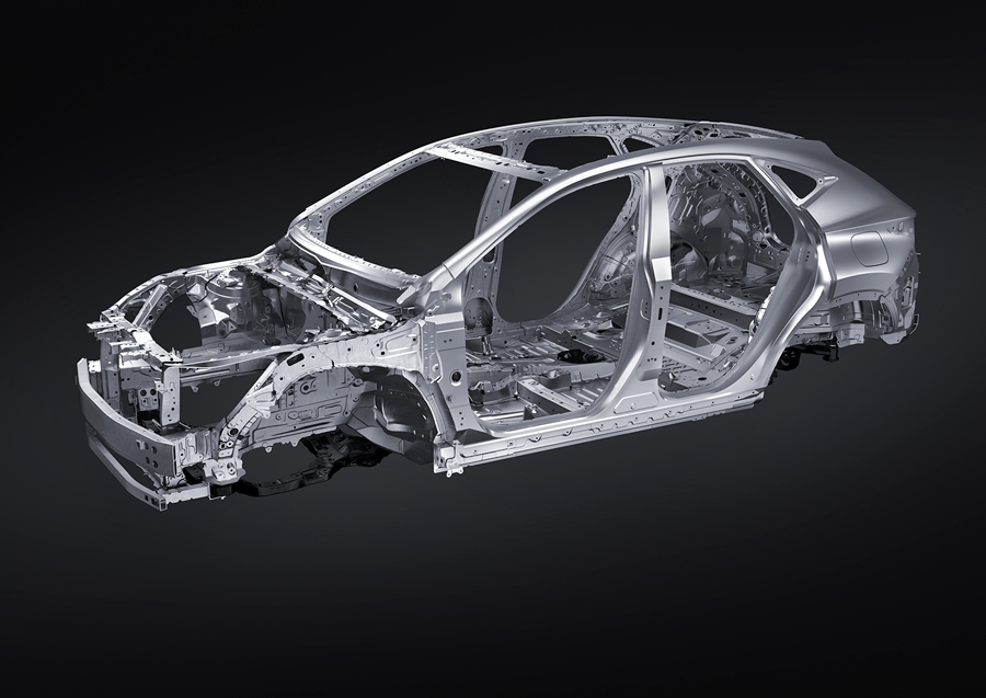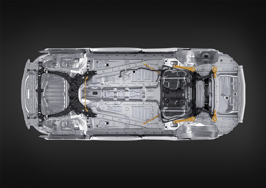 แผ่นเหล็กกันกระแทกด้านนอกผลิตขึ้นจากเหล็กกล้า 1180 MPa ด้วยกระบวนการเชื่อมแบบเทเลอร์แบล็งค์ (เบากว่าชิ้นส่วนโครงสร้างทั่วไป 1.6 กก.) และ ตัวเสริมความแข็งแรงบริเวณกลางหลังคานั้นผลิตขึ้นจากเหล็กแผ่นแบบรีดเย็นซึ่งมีความทนแรงดึงถึง 1470 MPa*3 (เบากว่าชิ้นส่วนโครงสร้างทั่วไปประมาณ 0.3 กก.) โครงสร้างที่ทำจากเหล็กที่มีความต้านทานแรงดึงสูงดังกล่าวจะช่วยเพิ่มความแข็งแรง ความปลอดภัย และการควบคุมรถที่มีประสิทธิภาพพร้อมกับลดน้ำหนักของรถลงด้วย