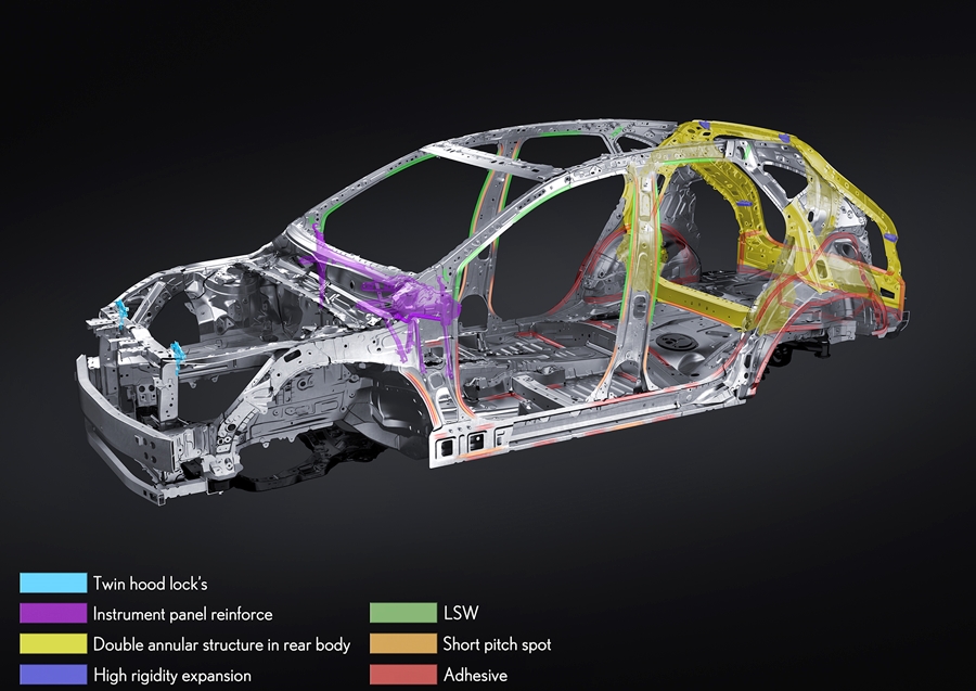เหล็กเสริมความแข็งแรงและแผงตัวถังถูกติดตั้งเพิ่มเข้ากับคานรองรับและชิ้นส่วนอื่น ๆ ของรถเพื่อให้ได้กำลังในการขับเคลื่อนสูงสุด ความแข็งแรงของโครงสร้าง GA-K ได้รับการพัฒนาโดยคำนึงถึงรูปร่างของโครงกระจังหน้าและมีการเพิ่มความหนาของแผ่นตัวถัง โครงสร้างส่วนบนของตัวรถยังได้รับประโยชน์จากฝากระโปรงหน้าที่มีโครงสร้างแบบล็อกคู่ ซึ่งนับเป็นครั้งแรกในรถยนต์ Lexus นอกจากโครงสร้างรูปวงแหวนแล้ว ยังมีการติดตั้งสารโฟมที่มีโครงสร้างแข็งแรงตามการวิเคราะห์ CAE เอาไว้ เพื่อลดการเสียรูปในช่องเปิดห้องเก็บสัมภาระด้านหลังได้อย่างมีประสิทธิภาพอีกด้วย นอกจากเทคโนโลยี laser screw welding (LSW) และกาวยึดโครงสร้างแล้ว เทคโนโลยี laser peening ยังได้รับการพัฒนาขึ้นใหม่เพื่อเชื่อมโครงรถอีกด้วย ด้วยการวางตำแหน่งที่เหมาะสมและการขยายความยาวของส่วนที่เชื่อมต่อ แรงยึดจะเพิ่มขึ้นประมาณ 35% เมื่อเทียบกับรุ่นธรรมดา