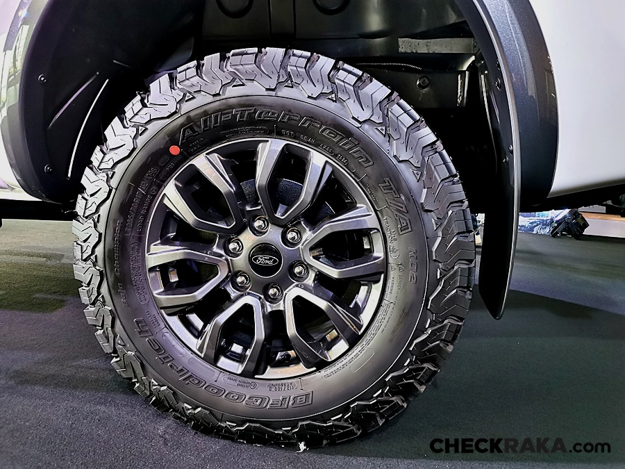 KO2 จาก BF Goodrich เช่นเดียวกับรถกระบะดีเอ็นเอฟอร์ด เพอร์ฟอร์มานซ์ อย่างฟอร์ด เรนเจอร์ แร็พเตอร์ ด้วยยางขนาด 265/70 R17 มอบความมั่นคงในการยึดเกาะถนนที่มีพื้นผิวขรุขระ และพื้นผิวด้านข้างที่คงทนยิ่งขึ้น เข้ากับล้ออัลลอยขนาด 17 x 8 นิ้ว ทั้งด้านหน้าและหลัง ออฟเซ็ท +42 มม. ทำให้ฐานล้อกว้างขึ้นถึง 26 มม. ขณะที่ล้ออะไหล่เป็นล้ออัลลอยพร้อมยางออลเทอร์เรนเช่นกัน