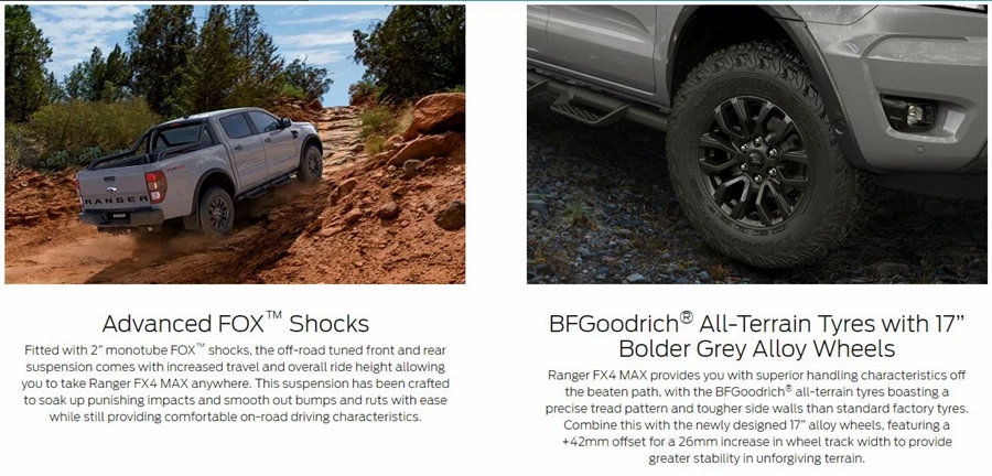 ฟอร์ด เรนเจอร์ FX4 Max ใหม่ พร้อมพิชิตเส้นทางสมบุกสมบันด้วยระบบกันสะเทือน FOX Shock แบบโมโนทิวบ์ขนาด 2 นิ้ว ทั้งด้านหน้าและหลัง โดยโช้คหลังมาพร้อมกับ Sub-Tank ช่วยเพิ่มประสิทธิภาพในการดูดซับแรงกระแทกและเพิ่มความทนทานในการใช้งานแบบออฟโร้ด ผสานกับคอยล์สปริงด้านหน้าที่มีการปรับจูนใหม่และการควบคุมความสะเทือนด้านหลังแบบโช้คไขว้เพื่อรองรับการบรรทุกสัมภาระ ด้านแหนบรองน้ำหนักได้รับการพัฒนาให้เหมาะทั้งกับการขับขี่แบบออฟโรดและยังพร้อมรับน้ำหนักในการบรรทุกและลากจูง ด้วยระบบกันสะเทือนที่ยกสูงขึ้น 20 มม. บวกกับการใช้ยางออลเทอร์เรน ทำให้ฟอร์ด เรนเจอร์ FX4 Max ใหม่ มี ระยะต่ำสุดจากพื้น (Ground clearance) ยกสูงจากพื้นถนนมากถึง 256 มม. ซึ่งสูงกว่ารุ่น XLT ยิ่งไปกว่านั้น ฟอร์ด เรนเจอร์ FX4 Max ใหม่ ยังมีมุมเงยและมุมจากที่ถูกยกระดับขึ้นจากรุ่น XLT เพื่อตอบสนองการทำงานของระบบขับเคลื่อน 4 ล้อได้อย่างเต็มที่