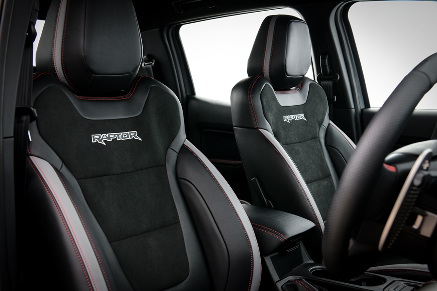 การตกแต่งภายในฟอร์ด เรนเจอร์ แร็พเตอร์ เอ็กซ์ ได้รับแรงบันดาลใจจากดีไซน์ภายนอก ไม่ว่าจะเป็นพวงมาลัยและแผงคอนโซลเดินตะเข็บด้ายสีแดงแทนการเดินตะเข็บด้ายสีน้ำเงิน ผสานกับการตกแต่งแผงคอนโซลและแผงประตูด้วยลาย Hydrographic และการใช้วัสดุสีดำ Black Alley อย่างลงตัว
