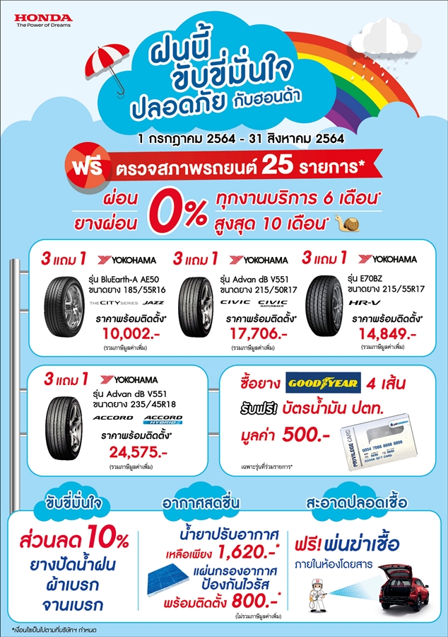 บริษัท ฮอนด้า ออโตโมบิล (ประเทศไทย) จำกัด ขอส่งความห่วงใยผ่าน แคมเปญ "ฝนนี้ ขับขี่มั่นใจ ปลอดภัยกับฮอนด้า" ชวนลูกค้าเตรียมความพร้อมของรถยนต์ให้อยู่ในสภาพสมบูรณ์พร้อมใช้งานเพื่อความปลอดภัยทุกเส้นทาง ด้วยการนำรถยนต์เข้ารับ บริการตรวจเช็กสภาพรถยนต์ฟรี 25 รายการ พร้อมสร้างความอุ่นใจและความปลอดภัยในสถานการณ์การแพร่ระบาดของเชื้อโควิด-19 ด้วย บริการฉีดพ่นน้ำยาฆ่าเชื้อโรคภายในรถยนต์ฟรี พร้อมแนะนำผลิตภัณฑ์แผ่นกรองอากาศป้องกันไวรัสและฝุ่น PM 2.5 รวมถึง ข้อเสนอสุดพิเศษเฉพาะลูกค้าฮอนด้า ทั้งโปรโมชั่นยางซื้อ 3 แถม 1 หลากหลายรุ่น ส่วนลดค่าอะไหล่ รวมถึงการผ่อนชำระค่าใช้จ่ายงานทุกงานบริการและยางรถยนต์ นานสูงสุดถึง 10 เดือน เมื่อนำรถยนต์เข้ารับบริการที่ศูนย์บริการฮอนด้าที่ได้มาตรฐานความปลอดภัย//ทั้ง 230 แห่งทั่วประเทศ ตั้งแต่วันที่ 1 กรกฎาคม 2564 - 31 สิงหาคม 2564