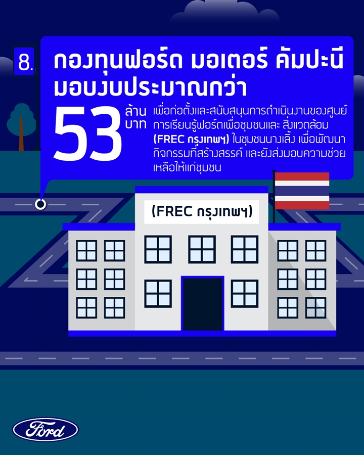 เมื่อปี พ.ศ. 2562 กองทุน ฟอร์ด มอเตอร์ คัมปะนี หน่วยงานเพื่อสังคมของ ฟอร์ด มอเตอร์ คัมปะนี ยังได้เปิดตัว ศูนย์การเรียนรู้ฟอร์ดเพื่อชุมชนและสิ่งแวดล้อม หรือ ศูนย์ FREC กรุงเทพฯ ณ ย่านนางเลิ้ง ซึ่งเป็นชุมชนเก่าแก่ที่มีประวัติศาสตร์ยาวนานของกรุงเทพฯ ด้วยเงินทุน 1.75 ล้านดอลล่าร์สหรัฐ หรือประมาณ 55 ล้านบาท เพื่อสนับสนุนการทำงานต่อเนื่องถึง 5 ปี โดยศูนย์ FREC กรุงเทพฯ เป็นศูนย์ FREC แห่งแรกในเอเชีย ที่เกิดจากความร่วมมือของกองทุนฟอร์ด และพันธมิตรองค์กรไม่แสวงหาผลกำไร ที่มุ่งมั่นแสวงหาทรัพยากรและบริการสาธารณะที่ตรงตามความต้องการและวัฒนธรรมของชุมชนโดยรอบ เพื่อช่วยพัฒนาความเป็นอยู่ของคนในพื้นที่รอบที่ตั้งหน่วยงาน ในปีที่ผ่านมา ศูนย์ FREC ยังได้ร่วมมือกับพันธมิตรจัดทำโครงการ Covid Relief Bangkok เพื่อแจกจ่ายอาหารและของใช้จำเป็นให้แก่ 32,000 ครอบครัวในชุมชนยากไร้ในกรุงเทพฯ ที่ได้รับผลกระทบจากสถานการณ์โควิด-19 และยังมีการดำเนินงานเพิ่มเติมเพื่อช่วยเหลืออีก 10,000 ครอบครัวในปีนี้