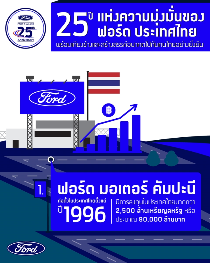 ฟอร์ด มอเตอร์ คัมปะนี ฉลองครบรอบ 25 ปี ในการดำเนินธุรกิจในประเทศไทย ตอกย้ำความมุ่งมั่นของฟอร์ดในการเป็นแบรนด์ระดับโลกที่มีบทบาทสำคัญในการขับเคลื่อนอุตสาหกรรมยานยนต์ไทยไปข้างหน้า นับตั้งแต่