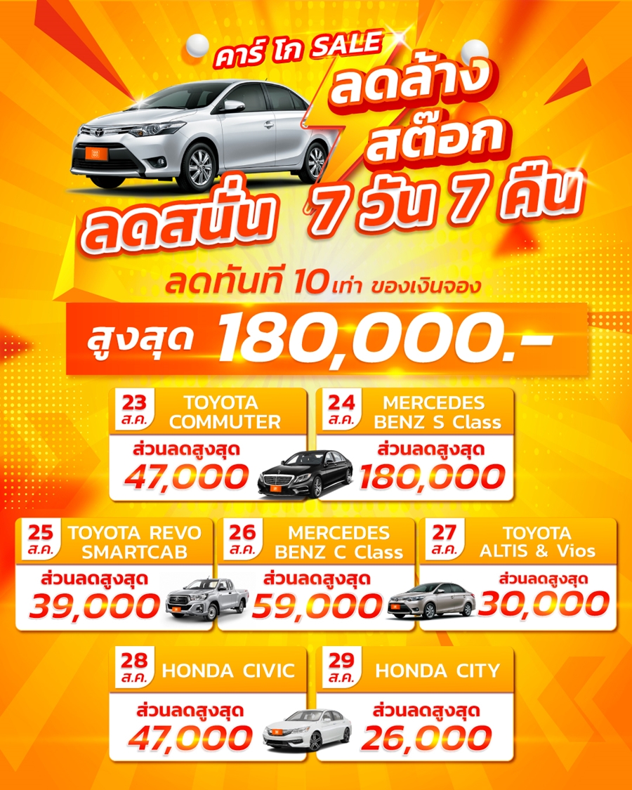 คาร์ โก จัดหนัก ลดล้างสต๊อกรถมือสอง อัดโปรโมชั่นเดือด 7 วัน 7 คืน ซื้อเงินสดได้ส่วนลดเพิ่ม 10 เท่า ของเงินจอง สูงสุด 180,000 บาท