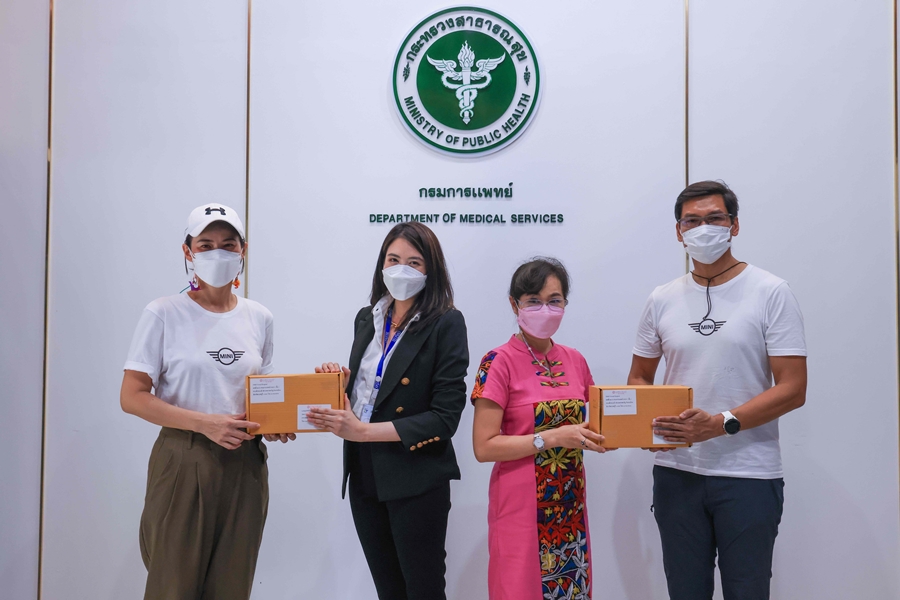 มินิ ประเทศไทย นำโดย คุณประภัสรา อร่ามวงศ์สมุทร ผู้อำนวยการ (ซ้ายสุด) ร่วมด้วย คุณกฤษฎา อุตตโมทย์ ผู้อำนวยการฝ่ายสื่อสารกิจการองค์กร บีเอ็มดับเบิลยู กรุ๊ป ประเทศไทย (ขวาสุด) เป็นตัวแทนรับมอบกล่องยาจาก กรมการแพทย์ กระทรวงสาธารณสุข เพื่อส่งต่อให้แก่ผู้ป่วยโควิด-19 Home Isolation ในกรุงเทพฯ และปริมณฑล โดยมี แพทย์หญิงปิยะธิดา หาญสมบูรณ์ (ที่ 3 จากซ้าย) ที่ปรึกษากรมการแพทย์ และ แพทย์หญิงพัณณพัชร บูรณศิรินทร์ (ที่ 2 จากซ้าย) คณะทำงานอาสาสมัครทีมแพทย์และเทคโนโลยีสนับสนุนมาตรการ Home Isolation กรมการแพทย์ ร่วมมอบ