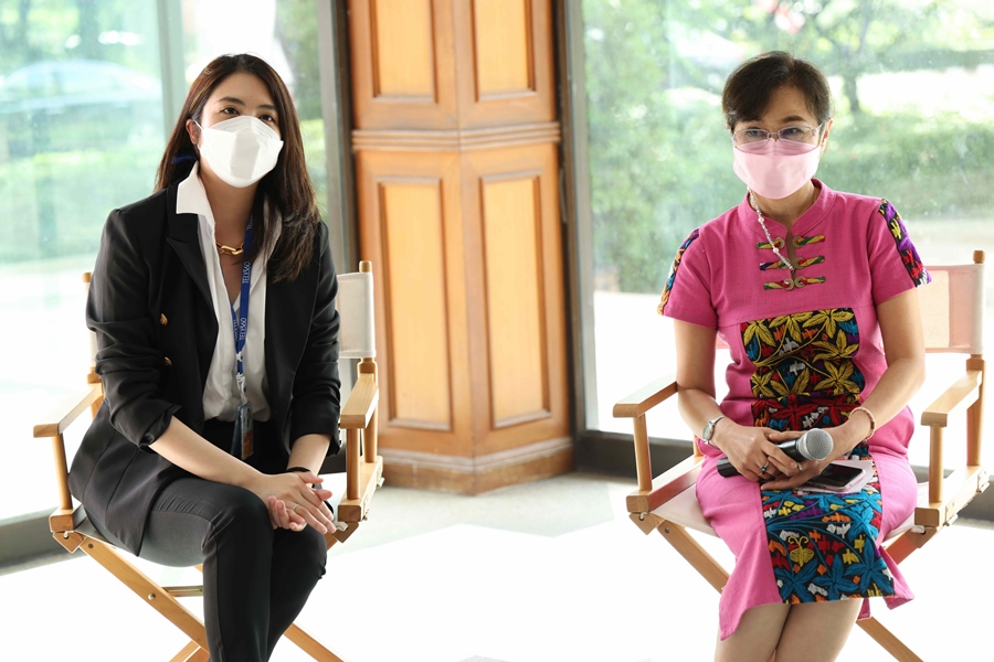 แพทย์หญิงปิยะธิดา หาญสมบูรณ์ (ขวา) ที่ปรึกษากรมการแพทย์ และแพทย์หญิงพัณณพัชร บูรณศิรินทร์ (ซ้าย) คณะทำงานอาสาสมัครทีมแพทย์และเทคโนโลยีสนับสนุนมาตรการ Home Isolation กรมการแพทย์ ร่วมให้ข้อมูลเกี่ยวกับการส่งกล่องยาและการดูแลผู้ป่วยที่กักตัวรักษาที่บ้าน