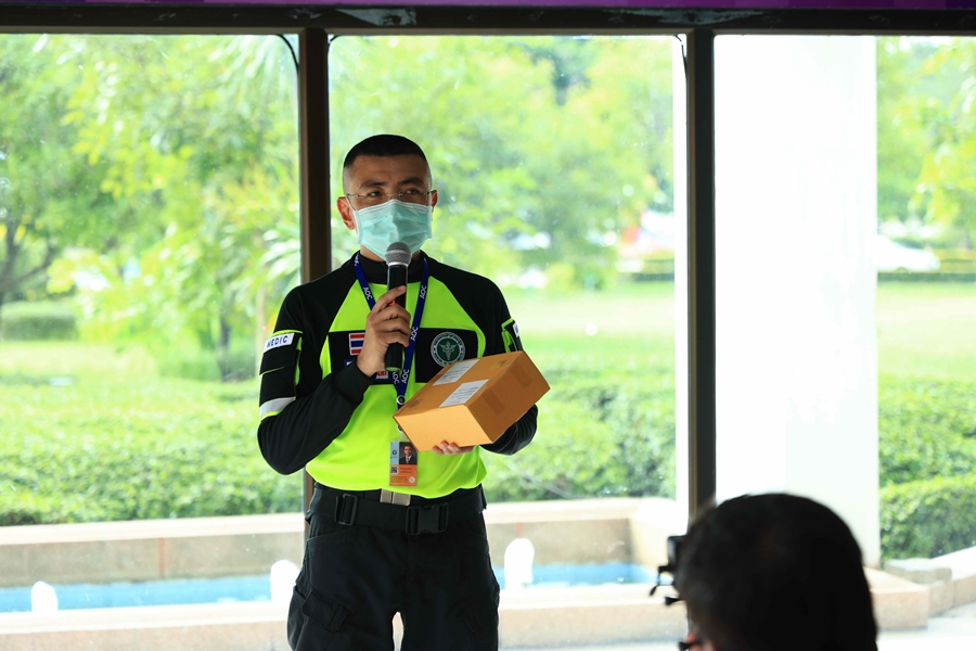 คุณชาณณุวัฒน์ วงศ์วิศวะกร ที่มาร่วมให้ข้อมูลเกี่ยวกับวิธีปฏิบัติในการส่งกล่องยาให้แก่ทีมอาสาสมัครจากสื่อมวลชน
