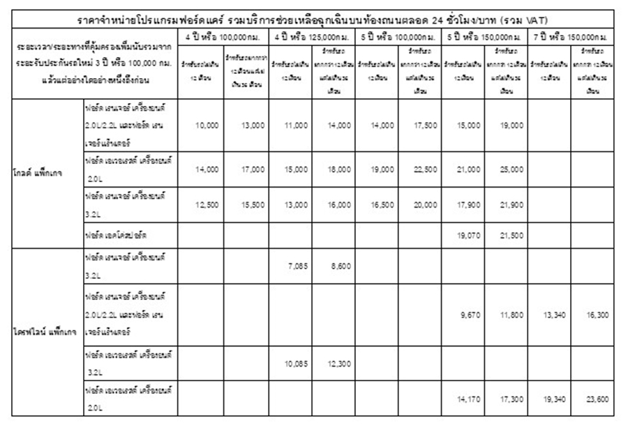 โปรแกรม FORD CARE ได้รับการพัฒนาขึ้นมาเพื่อมอบความคุ้มครองรถที่มุ่งเน้นมอบความอุ่นใจให้ลูกค้าสมาชิก โดยการขยายระยะรับประกันจะมีผลทันทีเมื่อการรับประกันรถใหม่สิ้นสุดลง โปรแกรม FORD CARE ประกอบด้วย Gold Package ซึ่งจะให้การคุ้มครองที่ครอบคลุม 13 กลุ่มอะไหล่ ซึ่งนับเป็นชิ้นส่วนอะไหล่ของตัวรถมากกว่า 1,000 รายการ และครอบคลุมถึงระบบเครื่องเสียง และระบบไฮเทคโนโลยี เพื่อให้สอดคล้องกับเทคโนโลยีใหม่ๆ ที่ติดมาพร้อมกับรถยนต์จากโรงงาน รวมถึงเคมีภัณฑ์ที่เกี่ยวข้องกับการเปลี่ยนอะไหล่ชิ้นนั้น และ Driveline Package จะให้ความคุ้มครองครอบคลุม 5 กลุ่มอะไหล่ โดยมุ่งเน้นความคุ้มครองในส่วนเครื่องยนต์และระบบส่งกำลัง โดยฟอร์ดได้ออกแบบความคุ้มครองของทั้งสองแพ็กเกจให้สอดคล้องกับเทคโนโลยีและนวัตกรรมของรถยนต์ฟอร์ดในปัจจุบัน โดยจุดเด่นของโปรแกรมฟอร์ดแคร์จะอยู่ที่ความหลากหลายของแพ็กเกจความคุ้มครองที่สามารถตอบโจทย์ความต้องการที่หลากหลายของลูกค้า โดยมีแพ็กเกจให้ลูกค้ารถยนต์ฟอร์ดได้เลือกสรรตามระยะความคุ้มครองที่หลากหลาย ดังนี้