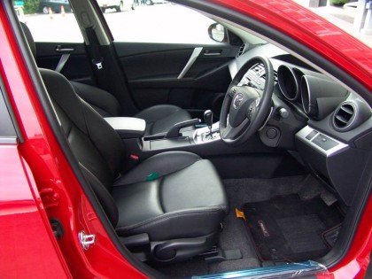 ห้องโดยสารคือ จุดเด่นของMazda ทุกรุ่นโดยเฉพาะรุ่น3 ที่ทำออกมาได้อย่างโดนใจนักขับทั้งหน้าใหม่และมือเก๋า เบาะแบบสปอร์ตหุ้มด้วยหนังแท้มีตำแหน่งการนั่งที่ครอบคลุมทุกสรีระ เบาะยังสามารถปรับให้ต่ำหรือสูง ทำให้การขับขี่ควบคุมอยู่ในระดับที่ดี ตำแหน่งของการจัดวางอุปกรณ์ยังคงเหมือนกับรุ่น 2.0 ลิตร แทบจะไม่มีผิดเพี้ยน ที่ขาดหายไปมีเพียงแค่แป้นเปลี่ยนตำแหน่งเกียร์หรือ Paddle Shift บนพวงมาลัยแบบสามก้าน ในตัวรถรุ่น 1.6 ยังคงมาตรฐานของวัสดุและอุปกรณ์ที่ Mazda ค่อนข้างใส่ใจในการคัดสรรพลาสติก หนัง และผ้ารวมถึงพรมคุณภาพดีมาตกแต่งภายในห้องโดยสาร ท่านั่งที่ดียังส่งผลไปถึงการควบคุมตัวรถในทุกระดับความเร็ว คอนโซลกลางใช้โฟมขึ้นรูป ห่อหุ้มด้วยวัสดุประเภทหนังสังเคราะห์ ช่วยในการกักเก็บเสียงแปลกปลอมยามวิ่งใช้งาน มาตรวัดแบบทรงกระบอกที่ช่วยเน้นบรรยากาศของการขับแบบสปอร์ต ตำแหน่งของการวางซุ้มเกียร์ออโต้4 สปีดและเบรกมือที่อยู่ใกล้มือคนขับช่วยให้การใช้งานมีความสะดวกมากยิ่ง ที่โดดเด่นมากคือมุมมองที่โปร่งโล่งรอบคัน แม้จะเป็นรถรุ่น 5 ประตูที่มีเสาหลังค่อนข้างใหญ่ แต่การมองเห็นหรือทัศนวิสัยโดยรวมอยู่ในขั้นที่ดี ภายในที่มีพื้นที่วางเท้าและพื้นที่เหนือศีรษะอยู่พอสมควร ยังช่วยทำให้ไม่รู้สึกอึดอัดอีกด้วย