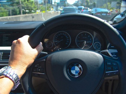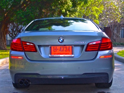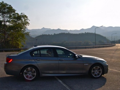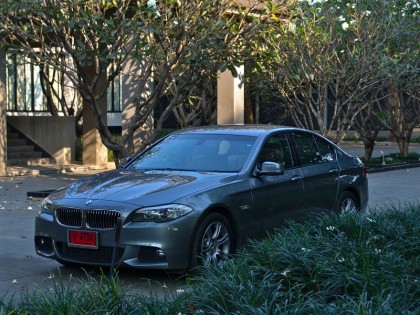BMW 528i TwinPower Turbo ใส่ชุดแต่งของ M GmbH คือ รถทดสอบที่ผมรับมาจาก BMW Group Thailand มันมีสีเทา และมีเรือนร่างที่ใหญ่โตเกือบเท่า Series 7 แม้จะเคยขับ Series 5 F10 มาแล้วถึง 2 รุ่น (525i-520d) แต่ความประทับใจยังคงไม่เสื่อมคลาย นี่คือรถซาลูนระดับพรีเมียมที่มีการขับขี่ควบคุมอยู่ในอันดับต้นๆ ของวงการยนตรกรรม ภายในห้องโดยสารสีน้ำตาลอ่อนมีคอนโซลสีทูโทนที่ตัดกันอย่างลงตัว พวงมาลัยหุ้มหนังแท้สีดำอวบอ้วนของ M ทรงสามก้าน กาบบันได M ล้อ M เบาะตัวใหญ่ที่นั่งขับได้สบายก้น และปรับให้สูงหรือต่ำได้เท่าที่ต้องการ ตำแหน่งของการนั่งขับถูกปรับให้ต่ำลงไปอีก รวมถึงพวงมาลัยก็ยังถูกปรับให้หดกลับไปใกล้กับหน้าปัดมาตรวัดตามความถนัด ผมชอบปรับเบาะให้ลงต่ำสุดเนื่องจากท่านั่งที่ต่ำจะช่วยในเรื่องของจุดศูนย์ถ่วงหากต้องขับเข้าโค้งเร็วกว่าปกติ สัมผัสกับพวงมาลัยที่คุ้นเคยในสไตล์ M กริ้บที่อวบใหญ่ทำให้การหมุนและจับยึดมีความมั่นคงสูง แป้นเปลี่ยนตำแหน่งเกียร์สีเงินทั้งสองข้างยังแสดงให้เห็นถึงความพิเศษของ รุ่น รวมถึงโหมดการขับขี่ที่ผมเลือกใช้โหมด ECO PRO ซึ่งเป็นโหมดประหยัดเชื้อเพลิงสำหรับการวิ่งแบบไม่รีบเร่งและเหมาะสำหรับการใช้งานบนสภาพการจราจรของกรุงเทพฯ ที่ค่อนข้างจะสาหัสจากรถยนต์จำนวนมหาศาลที่แออัดกันอยู่บนท้องถนน ไม่นับรวมอีก 80,000 คันที่จะตามออกมาในเร็ววันนี้