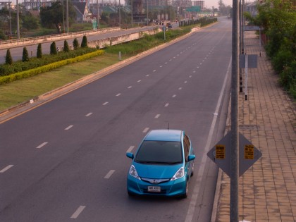 Jazz Hybrid สีฟ้าสดใสออกวิ่งทางไกลเป็นครั้งแรกโดยใช้เส้นทางวงแหวนตะวันออกที่เชื่อมต่อกับทางด่วนพิเศษฉลองรัช ผ่านวังน้อย แล้วเลี้ยวขวาขึ้นสะพานต่างระดับไปยังเส้นบายพาสเลี่ยงเมืองสระบุรีต่อ เชื่อมกับถนนมิตรภาพ มุ่งสู่มวกเหล็ก เขาใหญ่ เพื่อร่วมทดสอบ