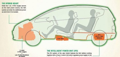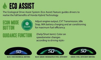 ระบบ Hybrid IMA ของ Honda ผสมผสานการทำงานของเครื่องยนต์และมอเตอร์ไฟฟ้า แบตเตอรี่ขนาดกะทัดรัดและเกียร์อัตโนมัติแบบแปรผันต่อเนื่อง CVT Continuously Variable Transmission ในช่วงออกตัวเครื่องยนต์จะทำหน้าที่หลักในการขับเคลื่อนและเสริมแรงด้วยมอเตอร์ไฟฟ้า ช่วงการขับขี่ด้วยความเร็วต่ำ เครื่องยนต์จะหยุดการทำงานและเข้าสู่โหมด EV-Electric Vehicle Mode โดยมอเตอร์ไฟฟ้าจะรับหน้าที่ขับเคลื่อนแต่เพียงอย่างเดียว (ที่ความเร็วต่ำและระยะทางประมาณ 1-3 กิโลเมตร) ช่วงเร่งแซง มอเตอร์ไฟฟ้าจะผสานการทำงานกับเครื่องยนต์ ในระหว่างการเบรก ระบบจะนำพลังงานที่สูญเสียไปขณะเบรกมาเปลี่ยนเป็นพลังงานไฟฟ้า แล้วส่งไปเก็บยังแบตเตอรี่ Hybrid เพื่อกักเก็บพลังงานไว้ใช้ต่อไป และเมื่อรถหยุดนิ่ง เครื่องยนต์และมอเตอร์ไฟฟ้าจะปรับตัวเองเข้าสู่โหมด Auto Start-Stop โดยหยุดทำงานทันทีแบบอัตโนมัติเพื่อช่วยประหยัดเชื้อเพลิงและลดมลพิษ