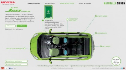 CRZ แต่มีเรี่ยวแรงน้อยลงมาตามสัดส่วนของการออกแบบระบบขับเคลื่อน ในช่วงของการออกตัว เครื่องยนต์จะเข้ามารับหน้าที่หลักในการสร้างแรงบิดและเสริมกำลังด้วย มอเตอร์ไฟฟ้าเพื่อเพิ่มประสิทธิภาพการเคลื่อนที่จากจุดหยุดนิ่ง เมื่อผมกดปุ่มโหมดประหยัดหรือ ECON Eco Assist (Ecological Drive Assist System) คันเร่งจะยืดหยุ่นการทำงานโดยลดความฉับไวลงเล็กน้อยเพื่อประหยัดเชื้อเพลิง ช่วงการขับขี่ที่ย่านความเร็วต่ำนั้น เครื่องยนต์จะหยุดการทำงานลงชั่วครู่และเข้าสู่โหมด EV หรือ Electric Vehicle Mode แบบอัตโนมัติ (ที่ระดับความเร็วไม่เกิน 80 กิโลเมตรต่อชั่วโมง) โดยที่มอเตอร์ไฟฟ้าซึ่งติดตั้งอยู่ในชุดเกียร์ CVT จะรับหน้าที่ขับเคลื่อนเพียงอย่างเดียว ส่วนช่วงของการเร่งความเร็วเพื่อแซงรถช้า หรือการออกตัวแบบฉับพลันทันที เมื่อผมกดคันเร่งไฟฟ้า Drive By Wire มอเตอร์ไฟฟ้าในระบบ Hybrid IMA จะเข้ามาทำงานพร้อมๆ ไปกับเครื่องยนต์ เพื่อสร้างแรงบิดสูงสุดสำหรับการเร่งความเร็วหรือแซง สำหรับการเบรก เมื่อรถหยุดสนิทนิ่ง เครื่องยนต์จะเข้าสู่โหมด Auto Start-Stop และหยุดการทำงานลง ระบบจะนำพลังงานที่สูญเสียไปขณะเบรกมาแปรเปลี่ยนเป็นพลังงานไฟฟ้า แล้วส่งกลับคืนไปเก็บยังแบตเตอรี่ท้ายรถเพื่อนำพลังงานมาใช้ต่อไป ระบบ Idling Stop จะหยุดการทำงานของทั้งเครื่องยนต์และมอเตอร์ไฟฟ้าลงเพื่อช่วยประหยัดเชื้อเพลิงและลดการปล่อย CO2 โดยที่คอมเพรสเซอร์ของระบบทำความเย็นจะหยุดทำงานไปด้วย เหลือเพียงแค่พัดลมในห้องโดยสารที่ยังคงทำงานอยู่ สำหรับระบบ Auto Start-Stop หรือ Idling Stop ใน Jazz Hybrid บางครั้งจะสั่งให้เครื่องยนต์ไม่ดับลงเนื่องจากแบตเตอรี่มีประจุกระแสไฟไม่พอ รวมถึงหากอุณหภูมิภายนอกสูงมากจนเกินไป ระบบจะสั่งให้เครื่องยนต์ติดตลอดอย่างต่อเนื่องเพื่อรักษาอุณหภูมิภายในห้องโดยสารในวันที่มีอากาศร้อนจัด