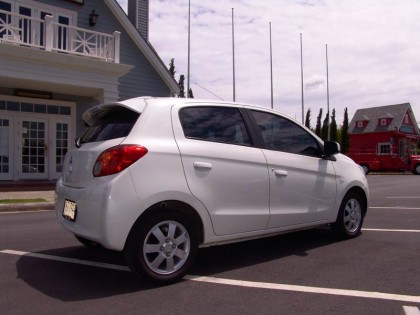 ด้านข้างของตัวถัง Mitsubishi Mirage ใช้เส้นนำสายตาลากทแยงจากซุ้มล้อไปจนจดไฟท้าย มือจับประตูและกระจกมองข้างยังคงใช้โทนสีเดียวกับรถ กระจกบานประตูหลังมีขนาดเล็กลงจากการออกแบบแนวหลังคาที่ลาดเอียงไปยังส่วนท้ายรถ Mitsubishi Mirage คันทดสอบใส่ล้ออะลูมินั่มอัลลอยลาย 7 ก้านสีเงิน ขนาดขอบ 14 นิ้่ว พร้อมยาง Bridgestone รุ่น Ecopia ไซส์ 165/65R14 ทั้งสี่ล้อ เป็นยางขนาดเล็กที่เน้นการลดแรงเสียดสีกับผิวถนนแต่ยังคงประสิทธิภาพของการยึดเกาะไม่แตกต่างจากยางแบบปกติ แก้มหน้ายังมีไฟเลี้ยวสีขาวติดมาให้เพื่อเพิ่มมุมมองให้กับรถคันอื่น ขณะต้องการเปลี่ยนทิศทาง รูปทรงแบบ 5 ประตูแฮตช์แบคยังคงมีความอเนกประสงค์ เมื่อต้องเปิดฝาท้ายพับเบาะหลังเพื่อขนสัมภาระชิ้นโตๆ