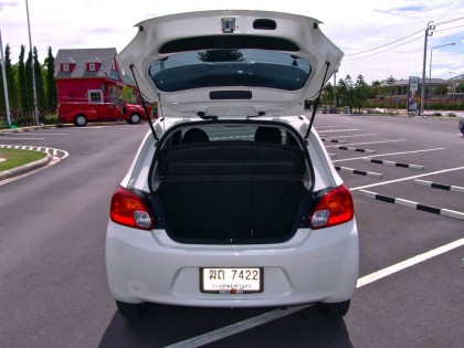 สัดส่วนบริเวณด้านหลังหรือบั้นท้ายของ Mitsubishi Mirage ใช้ไฟท้ายกรอบสี่เหลี่ยมแบบหลอดธรรมดาขนาดกำลังพอดี วางตำแหน่งอยู่ที่มุมทั้งสองข้างโดยมีฝาท้ายพร้อมมือจับเปิด-ปิดที่ใช้โทนสี เดียวกับตัวรถอยู่ตรงกลางตามสไตล์ของรถ 5 ประตู กระจกบานหลังมีขดลวดละลายฝ้าในกระจก พร้อมใบปัดน้ำฝนด้านหลังเพื่อช่วยทำความสะอาดตัวกระจกบานหลังเมื่อต้องวิ่งฝ่าสายฝน สปอยเลอร์หลังชิ้นใหญ่ วางตำแหน่งของกรอบป้ายทะเบียนไว้ยังบริเวณด้านล่าง ส่วนสปอยเลอร์ชิ้นบนที่ติดอยู่กับมุมบนของขอบกระจกบานหลังเป็นตำแหน่งของไฟเบรกดวงที่สาม ซึ่งใช้หลอดแบบ LED สีขาว ให้ความสว่างยามกดเบรก และสามารถเห็นได้อย่างชัดเจนในระยะไกล ฝาท้ายของเจ้า Mitsubishi Mirage ยังเปิดออกได้ด้วยมุมที่กว้างมากกว่าปกติ พื้นที่ภายในที่กว้างถึง 235 ลิตร ยังใช้เก็บถุง Golf หรือกระเป๋าเดินทางใบโตได้อย่างสะดวกโยธิน หากพับเบาะหลังก็ยังสามารถใส่จักรยานแบบพับได้อีกด้วย