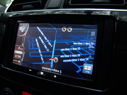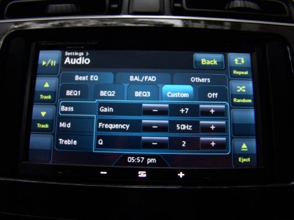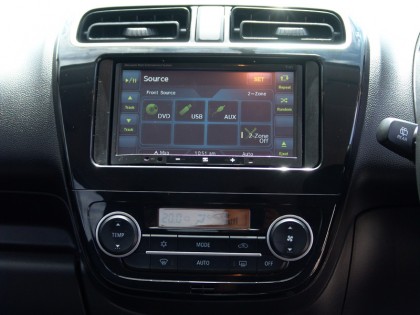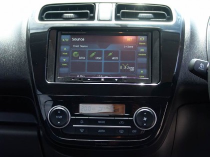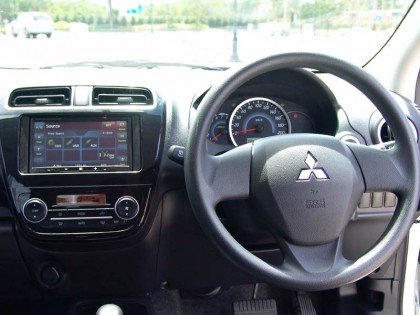ชิ้นงานที่โดดเด่นภายในห้องโดยสารของ Mitsubishi Mirage คือ คอนโซลกลางที่ใช้พลาสติกสีดำเงาล้อมกรอบเครื่องเสียงแบบระบบสัมผัส จอขนาด 7 นิ้วให้ความคมชัดในระดับพอใช้ได้ ภายในบรรจุเครื่องเล่น CD / MP3 / AM FM ระบบนำทางและกำหนดพิกัดด้วยดาวเทียมที่ใช้งานได้ง่ายเนื่องจากเป็นภาษาไทย ระบบนำร่องของ Mitsubishi Mirage มีรายละเอียดข้อมูลเส้นทางและสถานที่สำคัญทั่วประเทศ อ่านค่าและปรับตั้งได้ง่าย มีโปรแกรมการเข้าและออกจากเมนูด้วยภาษาไทย กับสัญลักษณ์ที่สามารถเข้าใจและเรียนรู้การใช้งานโดยใช้เวลาไม่นานนัก แผนที่ 3D ของระบบนำทางยังช่วยให้การขับเข้าไปยังพื้นที่ที่ไม่คุ้นชินมีความสะดวกมากยิ่งขึ้น