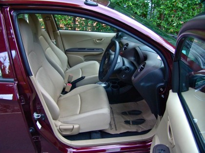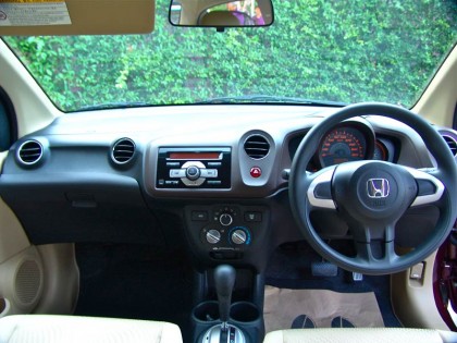 ห้องโดยสารคือหัวใจของ Amaze ในการใช้ต่อกรกับรถเล็กที่มีขนาดและราคาเท่ากัน คอนโซลพลาสติกเกรดต่ำสีน้ำตาลขึ้นรูป วางรูปแบบที่ไม่แตกต่างไปจากรุ่น 5 ประตู แต่หน้าปัดมาตรวัดของ Brio Amaze ใช้โทนสีที่แปลกแยกออกไป ไฟมาตรวัดสีเหลืองบนพื้นสีดำช่วยให้อ่านค่าได้ชัดเจน เบาะแบบสปอร์ตห่อหุ้มด้วยผ้าสีน้ำตาลอ่อนเพื่อทำให้ห้องโดยสารมีโทนสีที่ นุ่มนวลและดูเหมือนกับว่ามีมิติที่ใหญ่โตเกินจริง ช่องแอร์ทรงกลมมีชุดเครื่ิองเสียงอยู่ตรงกึ่งกลางในตำแหน่งที่เอื้อมมือไป ปรับตั้งได้ง่าย เครื่องเสียง 2 DIN แบบง่ายๆ เข้ากับรูปแบบและราคาค่าตัวให้เสียงในระดับพอใช้ได้ไม่โดดเด่นอะไร มันเล่นได้ทั้ง CD/MP3/AM/FM พร้อมสายเสียบเชื่อมต่อ USB ipod กับช่อง AUX สำหรับอุปกรณ์เล่นเพลงจากภายนอก สวิตช์ควบคุมอุณหภูมิทรงกลมสามอัน ที่วางแก้วน้ำและซุ้มเกียร์ออโต้ วงพวงมาลัยแบบสามก้าน หุ้มด้วยไวนิลไม่มีสวิตช์ปรับตั้งระบบต่างๆ มาให้เนื่องจากเป็นเพียงแค่อีโคคาร์ราคาไม่แพง